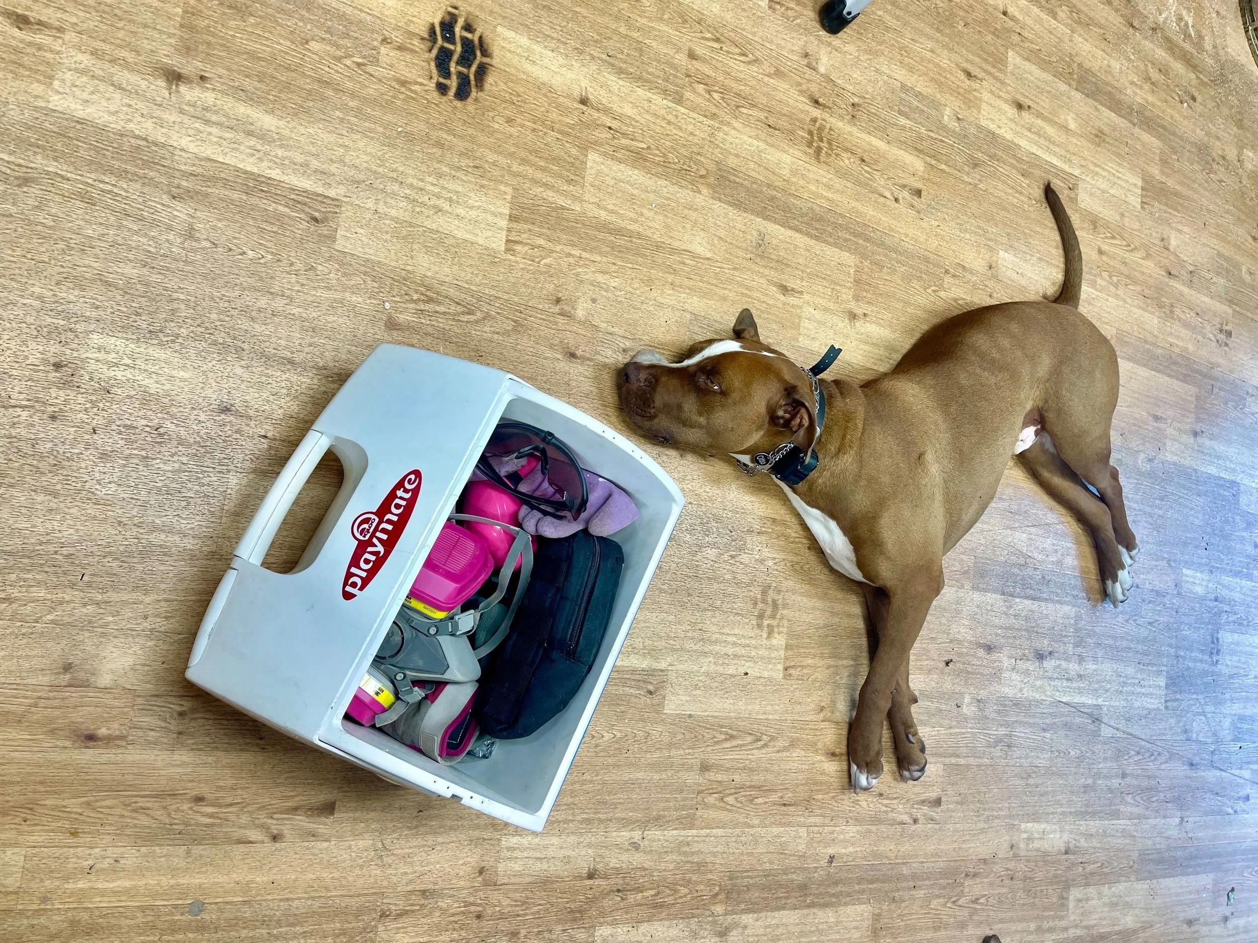 Every shop needs a supervisor — ours just happens to have four legs and the world’s biggest heart. Otto is our rescue pit-mix and the real star of The Knotty Couple.